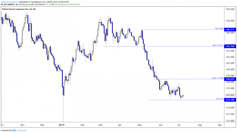As for the latest weeks, the price is really struggling to trade lower, and we have seen a few attempts to end the downtrend, the first one started June 4, followed by June 18, and now, the most recent one on July 3 is the failure of the price to trader lower on the break to the June 18 low.