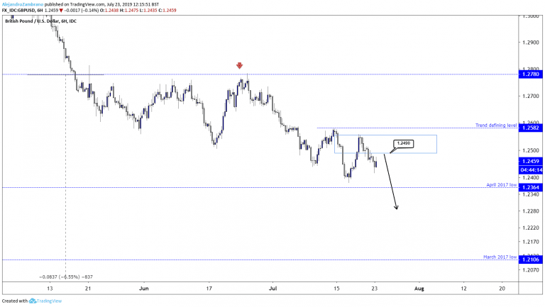 As for the technical outlook for GBPUSD, it remains bearish as the price has been trading lower since March when it reached 1.3379, and the last important swing high is the July 15 high of 1.2582. Below the July 15 high, the GBPUSD is at risk of trading to the April 2017 low of 1.2364, followed by the March 2017 low of 1.2106. The outlook is bearish as it is likely that there will be some hard negotiations between Westminster and Brussels, and Boris Johnson has not ruled out a hard Brexit.