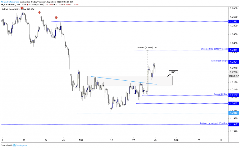 Technically, the GBPUSD trend remains upwards, and last week in our daily market brief I said that a break to 1.2210 could send the price higher. The price reached as high as 1.2293 and is still short from reaching the inverse head and shoulders pattern at 1.2361. The inverse head and shoulders pattern is derived by treating the August 12 low as the head, and the August 1 and 20 lows as the right and left shoulders respectively. The short-term trend will remain upwards as long as the price trades above the August 22 low of 1.2107, and I suspect that if the price might find support in the 1.2107 to 1.2214 interval, before revisiting last week’s high of 1.2294. However, if the price was to trade below the August 22 low then this would indicate that the GBPUSD might have resumed its multi-week downtrend.