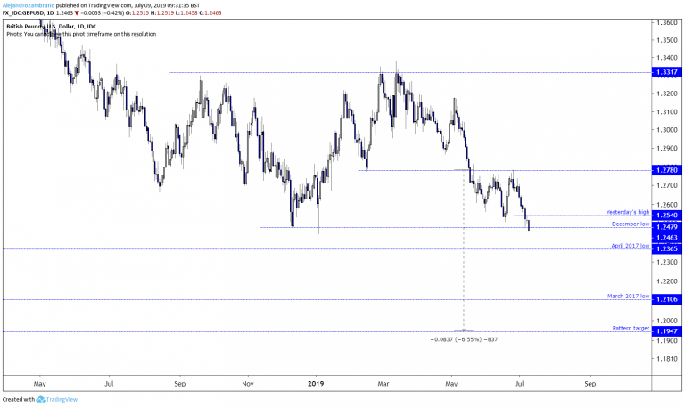 GBPUSD just slid to a new monthly low, and also traded below the December 2019 low of 1.2479, and the June 2019 low of 1.2510. At the time of writing the price was at 1.2466.