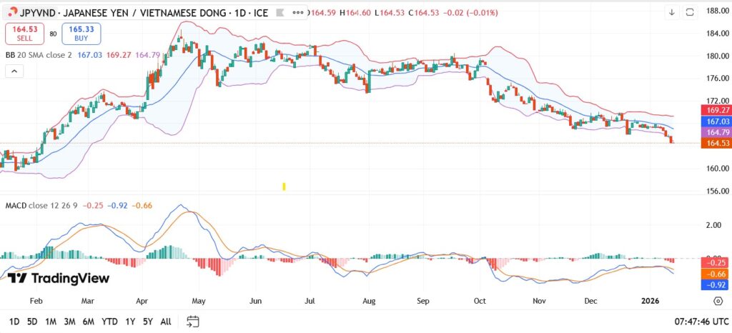 JPY/VND remains under pressure in Asian trading, slipping toward the 164.50 area as renewed weakness in the Japanese yen combines with thin liquidity in the cross. The pair is hovering near its lowest levels since mid-2024, with downside momentum reinforced by both political uncertainty in Japan and cautious market sentiment toward Japanese assets.