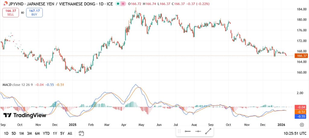 JPY/VND remains under pressure during Asian trading hours, trading around the 166.30–166.40 region as the Japanese yen continues to weaken against the Vietnamese dong. The pair is hovering just above its 52-week low, with downside momentum supported by light trading volumes and a lack of strong demand for the yen.