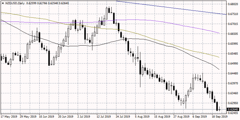 NZDUSD trading 0.12% higher at 0.6265 as the pair rebound from 4-year lows. Kiwi is under pressure after the central bank delivered a 50 bps interest rate cut that surprised the markets. NZDUSD traders awaiting the RBNZ decision on September 25th, with analysts forecasting that the central bank will leave the OCR unchanged at 1.00%.