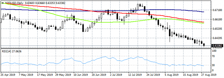 NZDUSD continues south for the second day in a row, trading 0.39% lower at 0.6336 piercing the lows from January 2016. RBNZ Governor Adrian Orr said that the recent interest rate cut reflected expectations of a decline in trading growth, lower New Zealand inflation expectations, and a swing by central banks to lower interest rates. The cut reduces the probability of having to do more later. Reserve Bank of New Zealand cut aggressively the OCR by 50bp to 1.00%, while the market forecasting a 25bp cut. The RBNZ Monetary Policy Committee expects growth to remain soft in the near term. RBNZ has revised its GDP forecasts lower accordingly by -0.3 to -0.5 through the second quarter of next year.