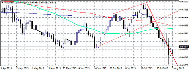 NZDUSD is trading 0.22 percent lower at 0.6493 as the pair rebounds for second day after Reserve Bank of New Zealand cut aggressively the OCR by 50bp to 1.00%, while the market forecasting a 25bp cut. The RBNZ Monetary Policy Committee expects growth to remain soft in the near term – although at 2.5% y/y in Q1, it is the envy of most other DM economies. Domestic demand is under pressure from a slowing housing market and subdued business confidence. The central bank has revised its GDP forecasts lower accordingly by -0.3 to -0.5 through the second quarter of next year.
