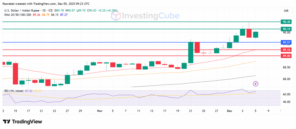 USD/INR trading pair on December 5, 2025, with key support and resistance levels. Created on: TradingView