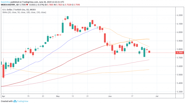 USDTRY is under selling pressure today giving up 0.51 percent at 5.7608. Macro data from USA yesterday disappointed USD investors as the New Home Sales Change (Month on Month) came in -7.8% lower at 0.626M below economist’s forecasts of 1.9% and 0.68M for May. The United States Richmond Fed Manufacturing Index came in at 3 below analyst’s forecasts of 5 for June. The consumer confidence weakened in June with the headlines Confidence Index dropping to 121.5 in June from 131.3 in May. Turkey’s Central bank kept the one-week repo rate at 24% earlier this month. CBRT will continue to support the current tight monetary conditions. Imamoglou victory in the Istanbul mayoral election also helped the Turkish Lira. Turkish economy facing numerous problems from US threats for sanctions because of the Russian S400 defense system, to tensions in the Aegean and the Mediterranean Sea with Greece and Cyprus as drillings in the area continues by the biggest oil companies.