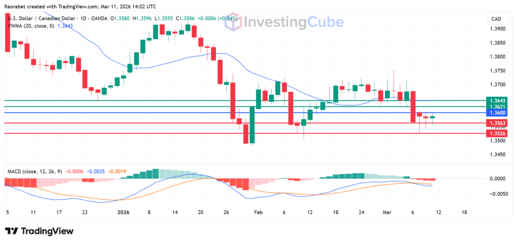 USD/CAD on the daily time frame showing key levels of resistance and support on March 11,2026. Created on TradingView