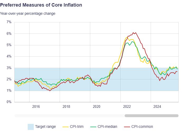 Bank of Canada prefers the measure of CPI-Common, Trimmed, and Median; the measure came lower but still above the target: 2.8%, 2.7%, and 2.5% repectively.