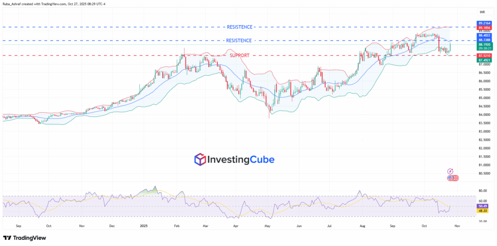 A clear daily close above 88.40 could pave the way toward the 89.18 level. The RSI is currently at 50, which is considered a neutral point, suggesting a weak short-term momentum. The market is in a phase of consolidation.