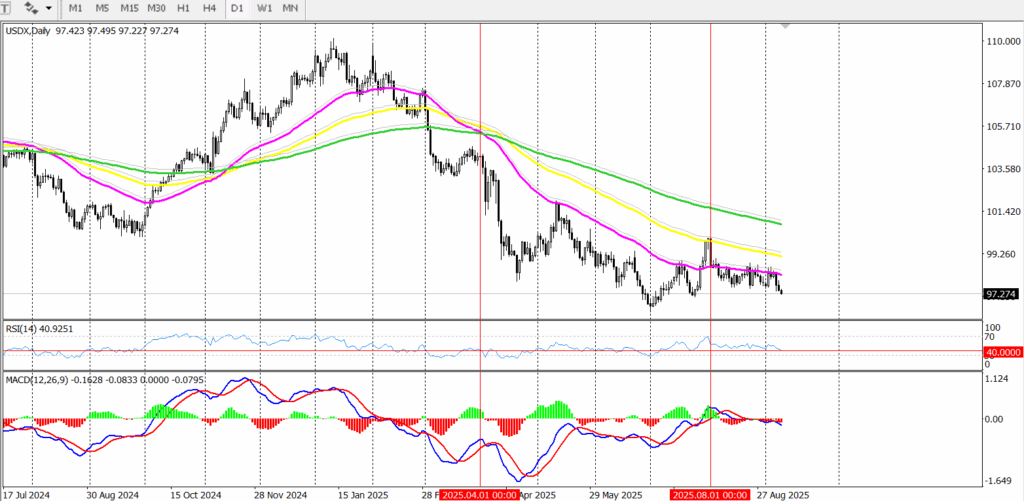 The USD failed to recover and consolidate above the 50-day moving average at the start of August 2025. On August 1, 2025, the Dollar Index gained bullish momentum, reaching 99.98, but failed to break out the 100-day moving average. The MACD on the daily chart indicates bearish momentum, while the RSI is hovering around 40, suggesting that selling pressure remains.