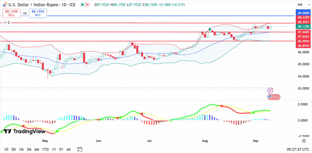 The USD/INR opens today positively by 0.24%. The currency pair is currently trading near 88.11 against the US. The US dollar extends its downside in response to the weakening US official job data.