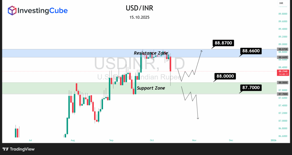 The sharp morning slide broke USD/INR out of its recent 88.75–89.10 consolidation range, sending it toward 88.10. From here: