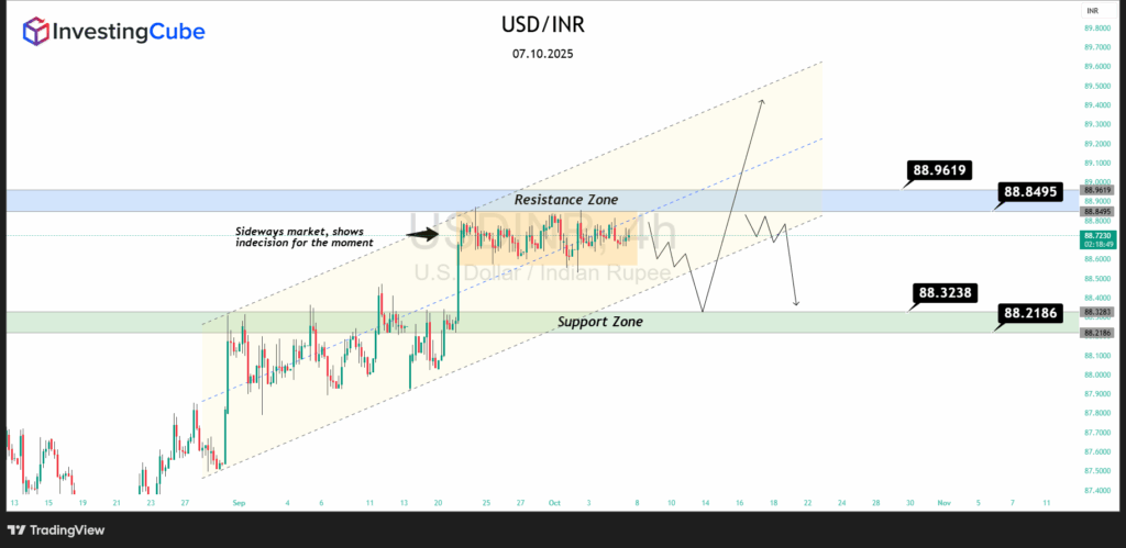 - Resistance Zone: 88.85 – 88.96. If USD/INR clears this band, the 89.10 record high is back in play, and beyond that the psychological 90.00 level looms large.