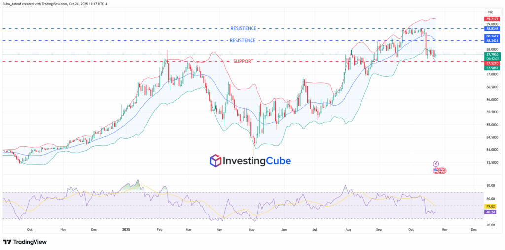 The RSI is at the 40 mark, indicating that the USD/INR is neither overbought nor oversold. It has mild bearish momentum but is not extreme.