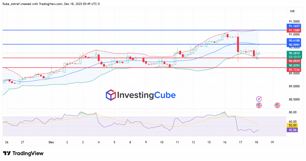 Currently, the USD/INR is stabilizing above the 90.00-89.72 support zone. This zone aligns with the lower Bollinger band and a previous consolidation area. As long as this support holds, the pullback may remain corrective rather than signalling a full trend reversal.