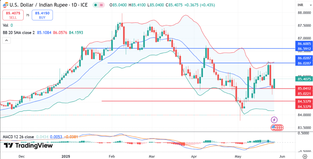 On the bullish side, the USD/INR is now trading under the pressure of a strong resistance level at 85.55. So any sustained breakout above this level could support the USD/INR to reach higher levels towards 86.02 and then 86.59. USD/INR Forecast for 2025, 2027, and 2030