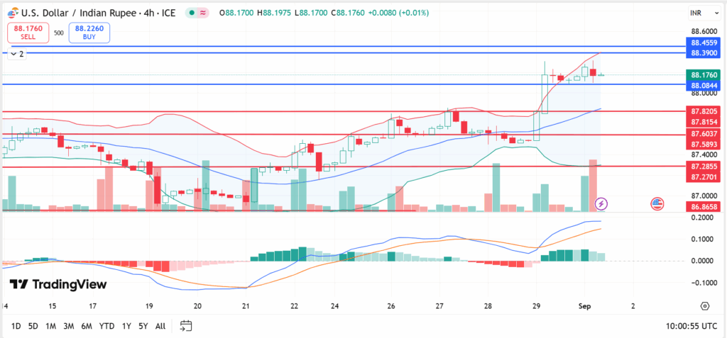 The USD/INR opened today at around 88.1610, and and remains near that level, trading at approximately 88.1450 at the time of writing, unchanged from Friday’s range. it’s currently trading under pressure of the resistance level at 88.3432.