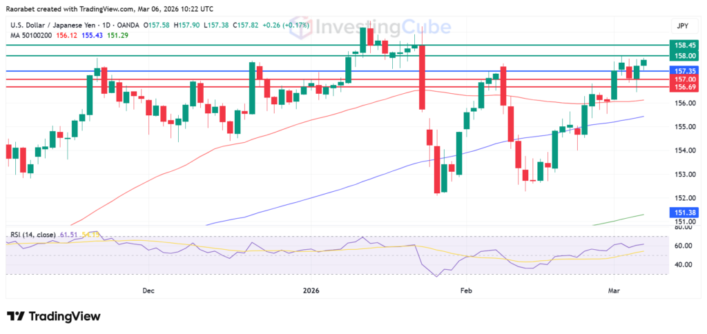 USD/JPY on the daily chart showing key levels of resistance and support on March 6, 2026. Created on TradingView