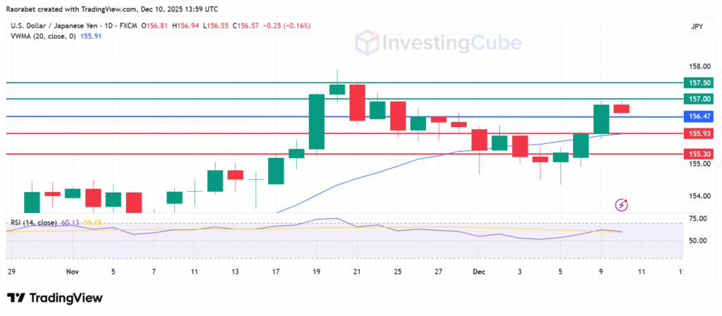 USDJPY daily chart with key support and resistance levels on December 10, 2025. Created on TradingView
