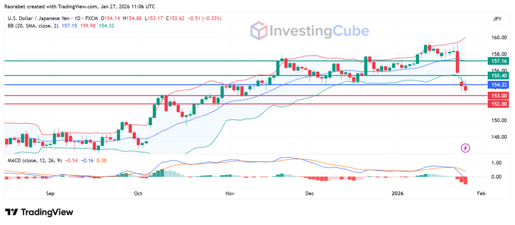 Immediate support is at 153.00, a level that matches lows from late 2025. If this fails, the 152.00 level is the next major target. Resistance is now at 155.40, followed by a strong selling area at the middle Bollinger Band at 157.16.