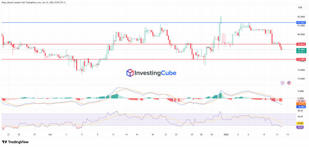 The USD/RUB pair is currently trading near 78.30, indicating short-term bearish pressure. Price action shows a clear rejection at the 81.34 resistance level, followed by a steady decline. This suggests that sellers are regaining control.