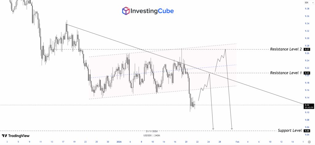 USD/SEK is subjected to renewed downside pressure as a weak U.S. dollar broadly meets with stronger medium-term SEK fundamentals and more supportive institutional forecasts. The pair is around the 9.12 – 9.13 area as of January 21, 2026 within striking distance of a major technical support level.