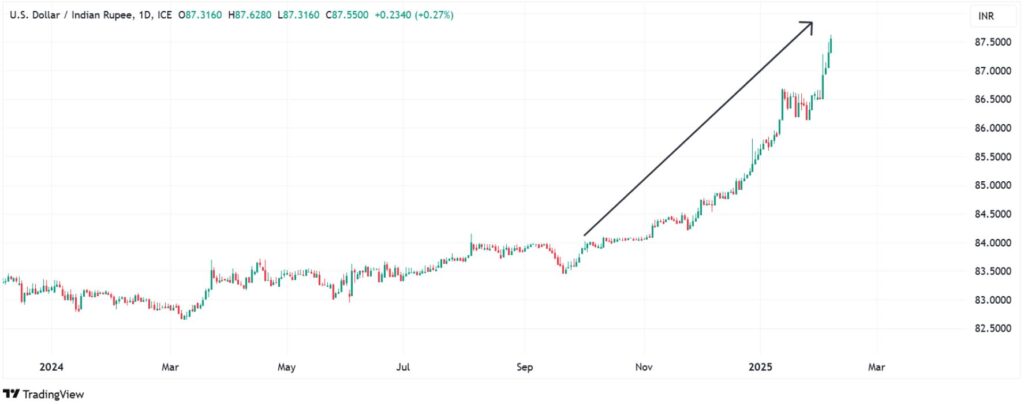 This move, which was reportedly a response to India’s continued energy purchases from Russia, has dented foreign investment sentiment and led to capital outflows from India, putting immense pressure on the Rupee. The rate has now consistently held above the 87.00 mark and has even touched a record low near 88.50.