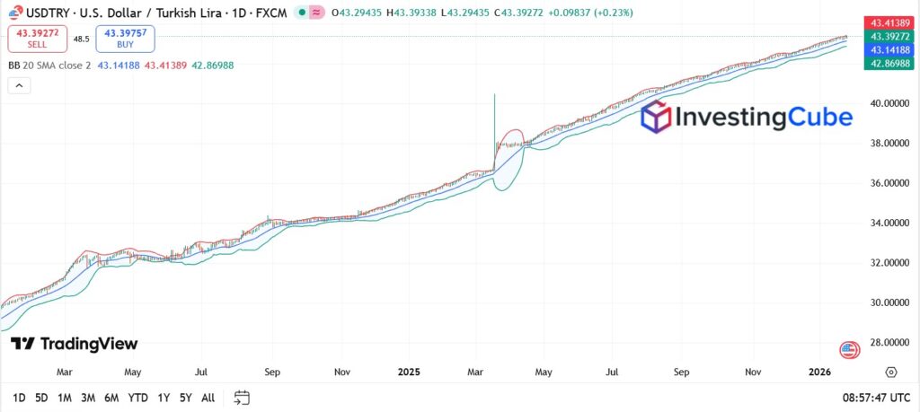 USD/TRY has extended its record-breaking run this week, trading near the 43.40–43.45 region as of Tuesday. This follows the Central Bank of the Republic of Turkey’s (CBRT) first policy meeting of 2026, where officials lowered the benchmark one-week repo rate by 100 basis points to 37%.