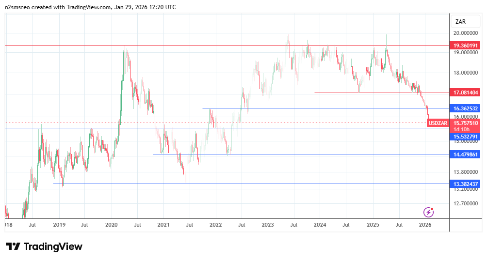 The USD/ZAR is trading at 15.7381, just ahead of the South African Reserve Bank (SARB) interest rate decision on 29 January. The pair is in a downtrend, having fallen steeply from the 7 April 2025 pinbar candle’s high of 19.9328. The recovery attempt stalled at 16.21 on 22 January, but the pair faltered immediately after, as the bulls were unable to regain prior highs.