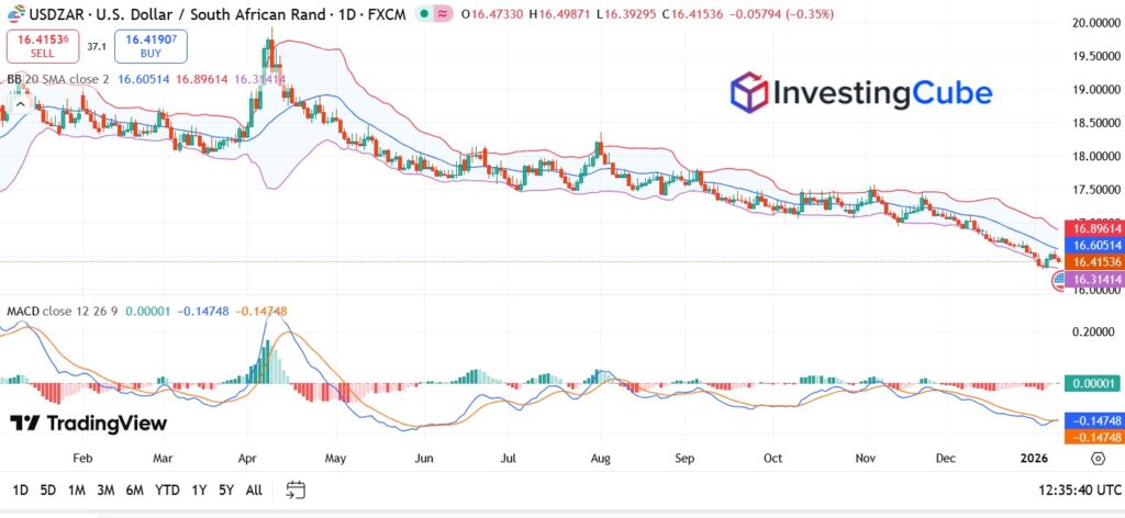 From a technical perspective, USD/ZAR remains firmly under bearish pressure on the daily chart. The pair continues to trade below its 20-day moving average and along the lower Bollinger Band, highlighting sustained downside momentum rather than a temporary pullback.