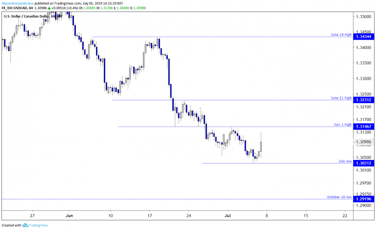 It is not all surprising that the price is having a hard time to turn bullish as the USDCAD has been declining over the last few weeks. Realistically the price needs to take out the July 1 high to make more damage to the bears, and have an improved chance of turning higher. On a break to the July 1 high of 1.3146 the price will have stopped to create lower highs, and traders might target the next high at the June 21 high at 1.3231. However, as long as the July 1 high holds the price will remain bearish and the USDCAD might revisit this week’s low. However, despite the bearish trend, I think it is fair to assume that traders will be careful given the combination of soft Canadian data and strong US data, and wait until Monday before adding to their bearish exposure, alternatively they will wait for a break to the July low at 1.3031.Don’t miss a beat! Follow us on Twitter.