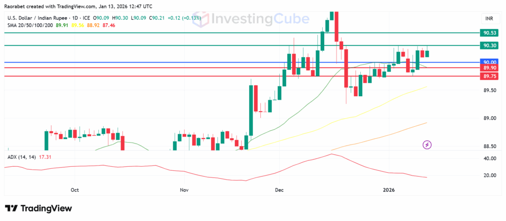 USD/INR on the daily chart with the ADX and key support and resistance levels on January 13, 2026. Created on TradingView