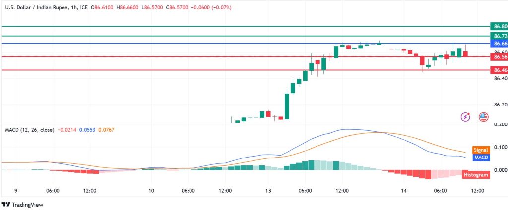 USDINR pivots at 86.66 and the momentum indicators favours the downside to prevail. The currency pair will likely find the first support at 86.56, but a stronger downward momentum could take it lower to test 86.46.