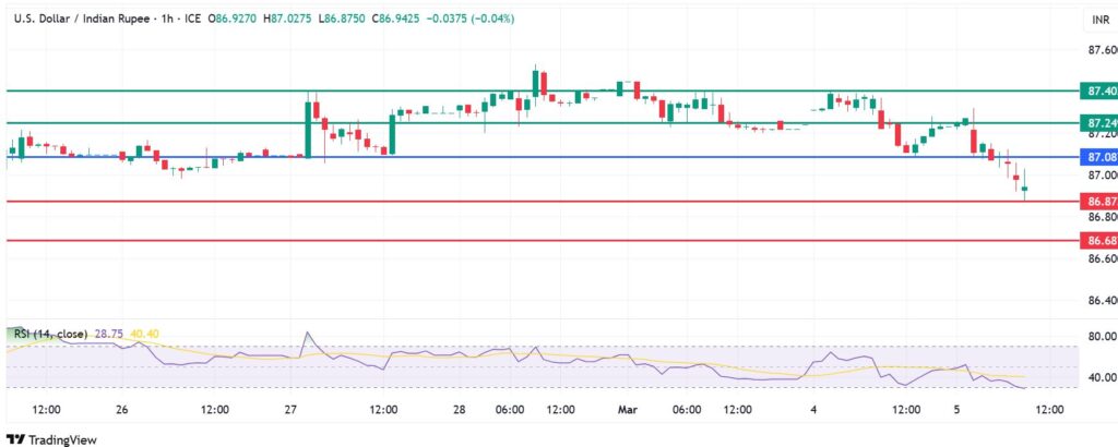 Alternatively, the momentum will shift to the upside if USDINR breaks above 87.08. If that happens, the pair is likely to head higher to find the first resistance at 87.24. The downside narrative will be invalid if action goes above that level. Also an extended control by the buyers could resuslt in further gains and test the second resistance at 87.40.
