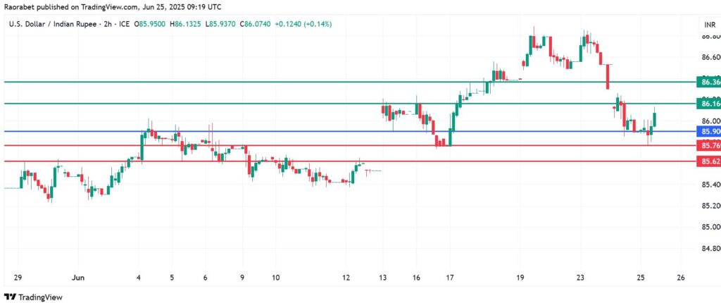 The USDINR currency pair trades flat in the Asian session, going at 85.92 at the time of writing as the dollar mounted a fightback after three sessions on the decline. The Israel-Iran ceasefire seems to be holding 24 hours after it was announced, diluting the US dollar’s safe haven strength. The rupee is strengthened by oil prices which initially declined but have returned to the upside in the early hours of Wednesday.