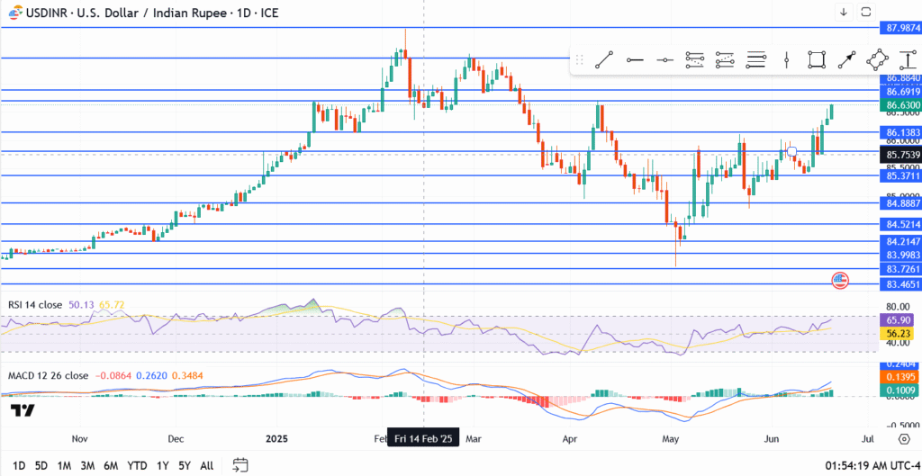 The rupee’s current weakness is caused by a strong U.S. dollar, Powell’s firm tone, and rising oil costs are stacking the odds against it. With USDINR hovering just below ₹86.88, bulls only need one more push to crack that resistance wide open.