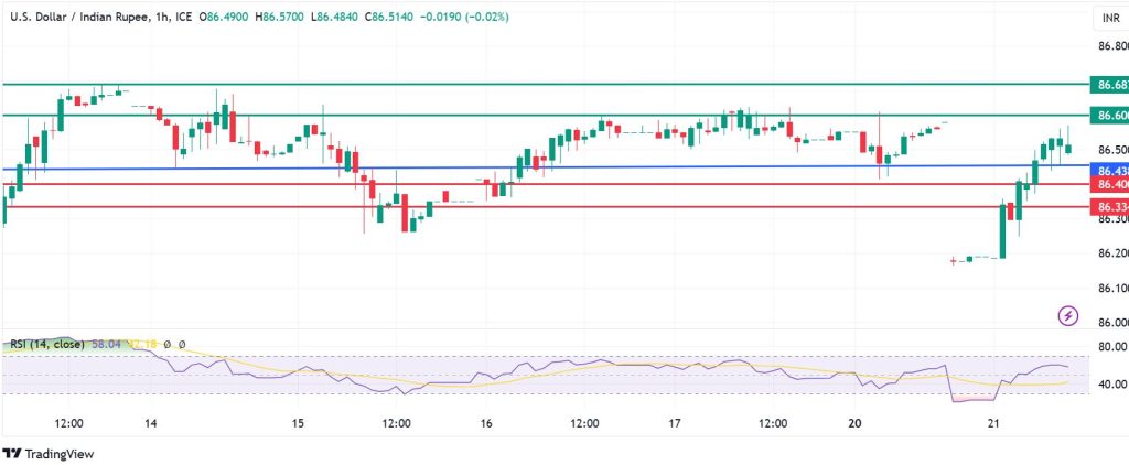 USDINR pivots at 86.43 and the upside will prevail if action stays above that level. Immediate resistance is likely to be at 86.60. However, an extended upward momentum will break above that level and could test the second resistance at 86.68.