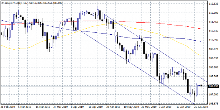USDJPY is giving up 0.09 percent at 107.68 ahead of the G20 meeting in Osaka, Japan. Earlier today the report on Japanese Housing Starts, Year on Year, came in at -8.7% worst than analyst’s forecasts of -4.3% for May. Macro data from USA yesterday failed to impress USD investors The Personal Consumption Expenditures Prices reported at 0.5% on a quarterly basis for first quarter better than analysts’ forecast. The initial Jobless Claims came in at 227,000 beating analyst’s estimates of 220,000 for June 21. The US Dollar price dynamics will continue to drive the pair’s momentum and today USD is weaker across all majors.