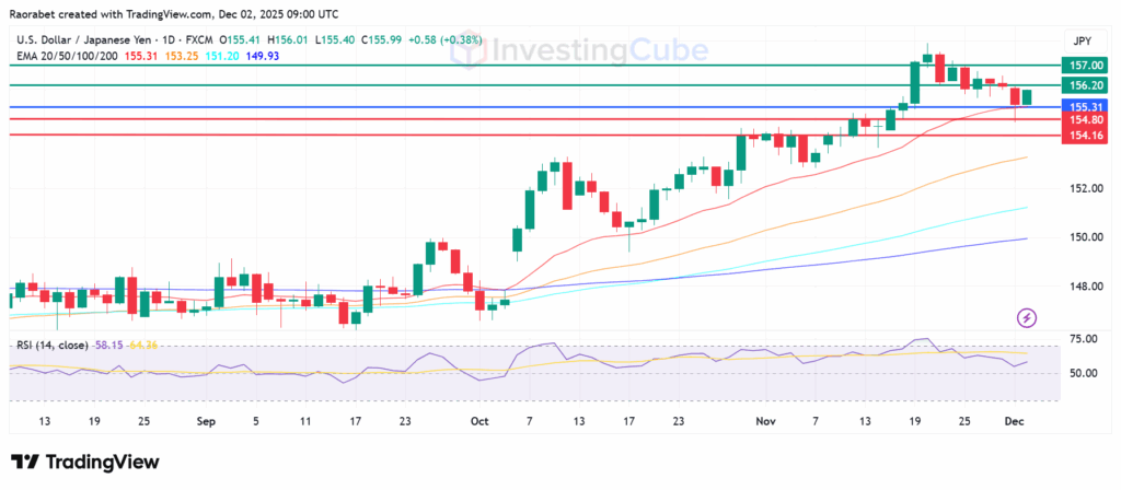 USDJPY daily chart on December 2, 2025 with key support and resistance levels. Created on TradingView