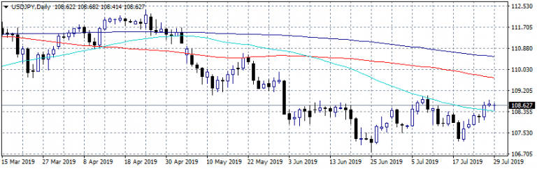 USD continues with positive momentum as traders looking for a 25 basis point interest rate cut by Fed on Wednesday. Japan Retail Trade (year over year) came in at 0.5%, beating forecasts of 0.2% in June, Retail Trade s.a (month over month) registered at 0%, below expectations (0.8%) in June and Large Retailers’ Sales registered at -0.5% topping expectations of -0.7% in June.