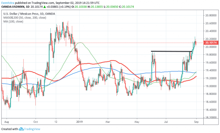 USDMXN adds 0.18% at 20.0992 as bulls are in full control close to yearly highs. The Bank of Mexico cut interest rates for the first time since 2014 by 25 basis points to 8%. I believe that Banxico will continue in that direction with two more rate cuts before the year end.