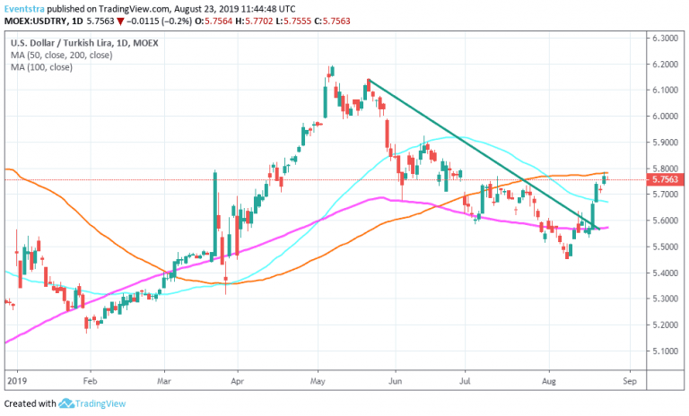 USDTRY gives up 0.05% today at 5.7591 but continues the rebound from 5.45 recent lows to two-week highs. The pair accelerated the upward move after the price pierced the descending trendline from May 23rd. Yesterday, the United States Initial Jobless Claims came in at 209K, below forecasts of 216K in August 16, the Initial Jobless Claims 4-week average increased to 214.5K in August 16 from previous 213.75K. Turkey Consumer Confidence rose from previous 56.5 to 58.3 in August. Turkey’s jobless rate rose to 12.8 per cent in May 2019 from 9.7 per cent in the same period of the previous year.