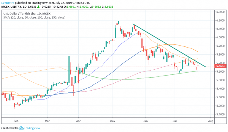 Turkish lira (USDTRY) gives up over 0.48 percent against the greenback as we approach Turkey’s central Bank next policy meeting on July 25 at 11:00GMT. The economist’s expectation is for an interest rate by cut by 250 bps from its current 24%. Turkey’s central bank kept the one-week repo rate at 24% in June 2019.
