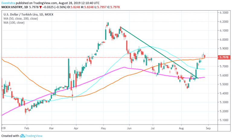 USDTRY gives up 0.54% today at 5.7986 as the bull run from 5.45 recent lows (August 8th) is intact. The pair accelerated the upward move after the price pierced the descending trendline from May 23rd. United States MBA Mortgage Applications came in down to -6.2% on August 23, from previous -0.9%. Earlier today, Turkey Economic confidence index came in at 87.1 for August versus 80.7 previous reading making 12-month highs.