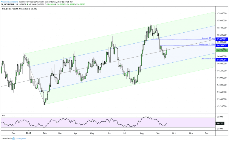 Technically, the USDZAR looks to have carved out a low at last week’s low of 14.50. Yesterday, the price jumped higher as the new week started, and the price has traded higher ever since. Today, the price is trying to trade above the median line at 14.78, and if successful the USDZAR could reach the September 5 high at 14.90, followed by the August 23 low at 15.07. The short-term trend will remain upwards as long as the price trades above last week’s low of 14.50.
