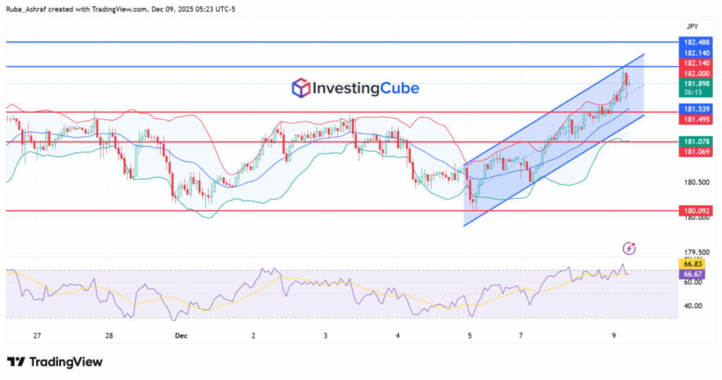 The price action shows that the EUR/JPY is moving within an ascending channel. The price tested the upper boundary of the ascending channel but failed to break through. This failure indicates that buying momentum is weakening, suggesting a bearish correction. A clear 1-hour close below the mid-line of Bollinger bands at 181.54 could pave the way towards 181.076.