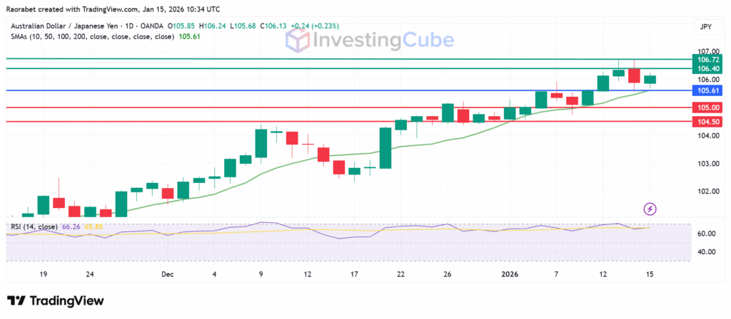 AUD/JPY daily chart on January 15, 2026 with key support and resistance levels. Created on TradingView