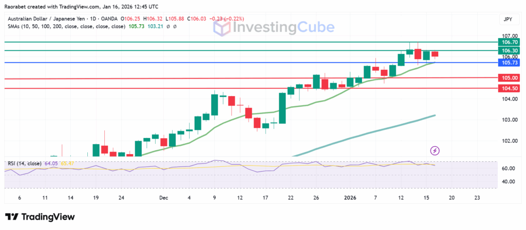 AUD/JPY is trading at 106.03, showing some short-term negative signals even though the trend is still mostly up. The Relative Strength Index (RSI) has dropped from 72 to 64, suggesting that the market is less overheated, and momentum is slowing. The pivot is at 105.73, which is the 10-day Simple Moving Average (SMA). With the buyers in control, the 106.30 level is the next major resistance point.