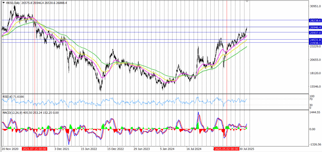 The Hang Seng has been consolidating above the 50-day, 100-day, and 200-day moving averages since May 2025 on the daily chart. The price action has been forming higher highs consecutively. These higher highs are 23,938, 24,531.8, 25,937.0, and today’s high at 26946. Each high is now acting as a support regardless of today’s high.
